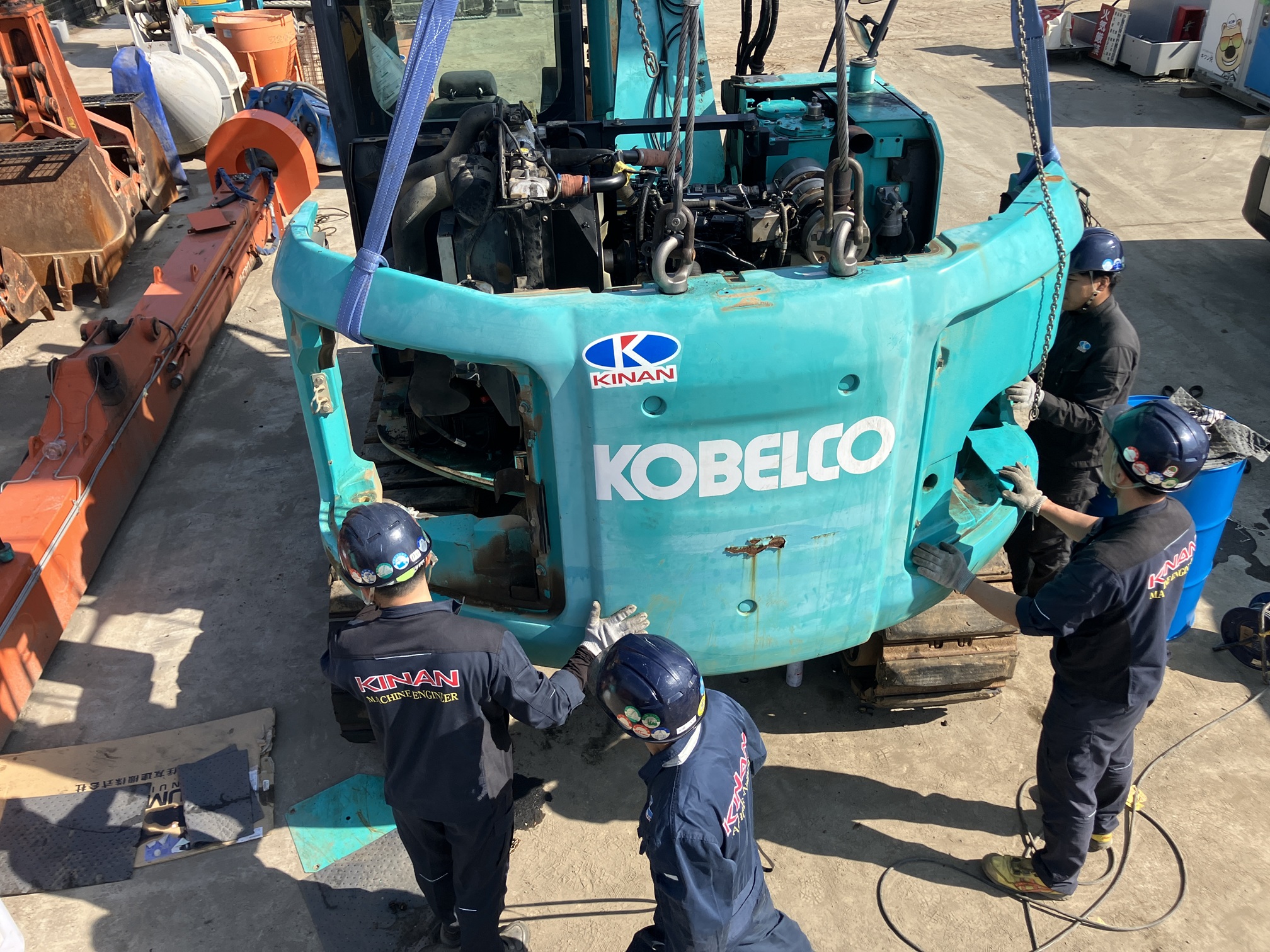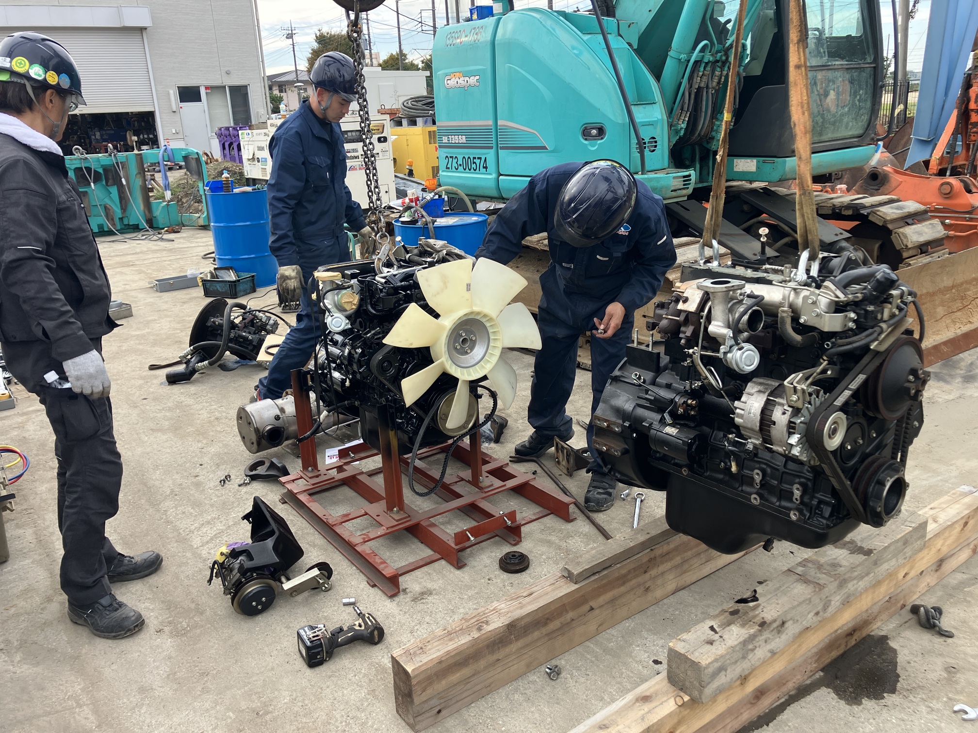講習も兼ねて、0.45㎥バックフォーのエンジン載せ替えにチャレンジしました!!