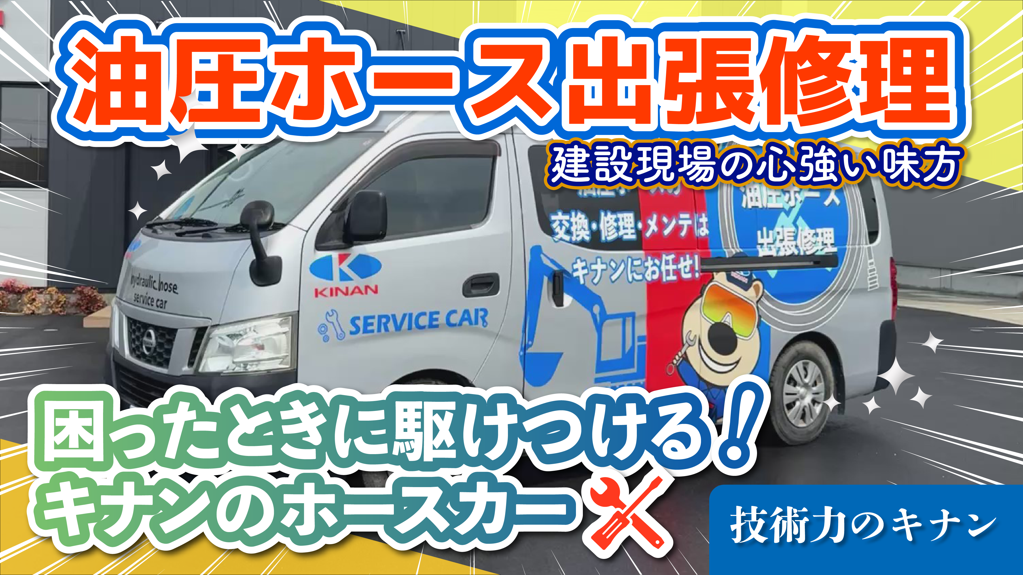 キナンのホースカーは、油圧ショベルなど建設機械の油圧ホーストラブルに即応する出張修理サービスカーです。現場を止めないため、熟練のスタッフが迅速かつ確実に対応。今回は、そんなホースカーの出動現場に密着し、キナンの技術力と対応力をご紹介します。